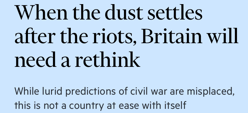 Simon Kuper, always excellent, provides an interesting contrast. He starts with the tough question: ‘What makes somebody riot?’ Kuper supplies multiple answers to a deceptively simple query. Yes, they were, in part, an emotional but utterly wrong response to the appalling murders of three little girls in Southport.