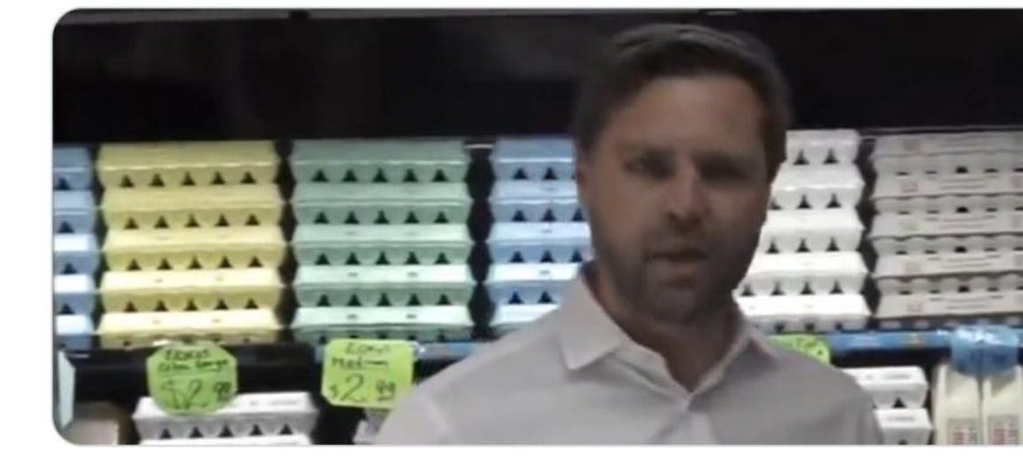This is the return of “It’s the economy, stupid”. J D Vance complained bitterly about the price of eggs in an attempt to pin high grocery prices on Biden/Harris. It worked, notwithstanding the fact that his claim about eggs costing $4 was a lie, as evidenced by the prices ($2.99) on the supermarket shelves in the shot of Vance in a supermarket.
